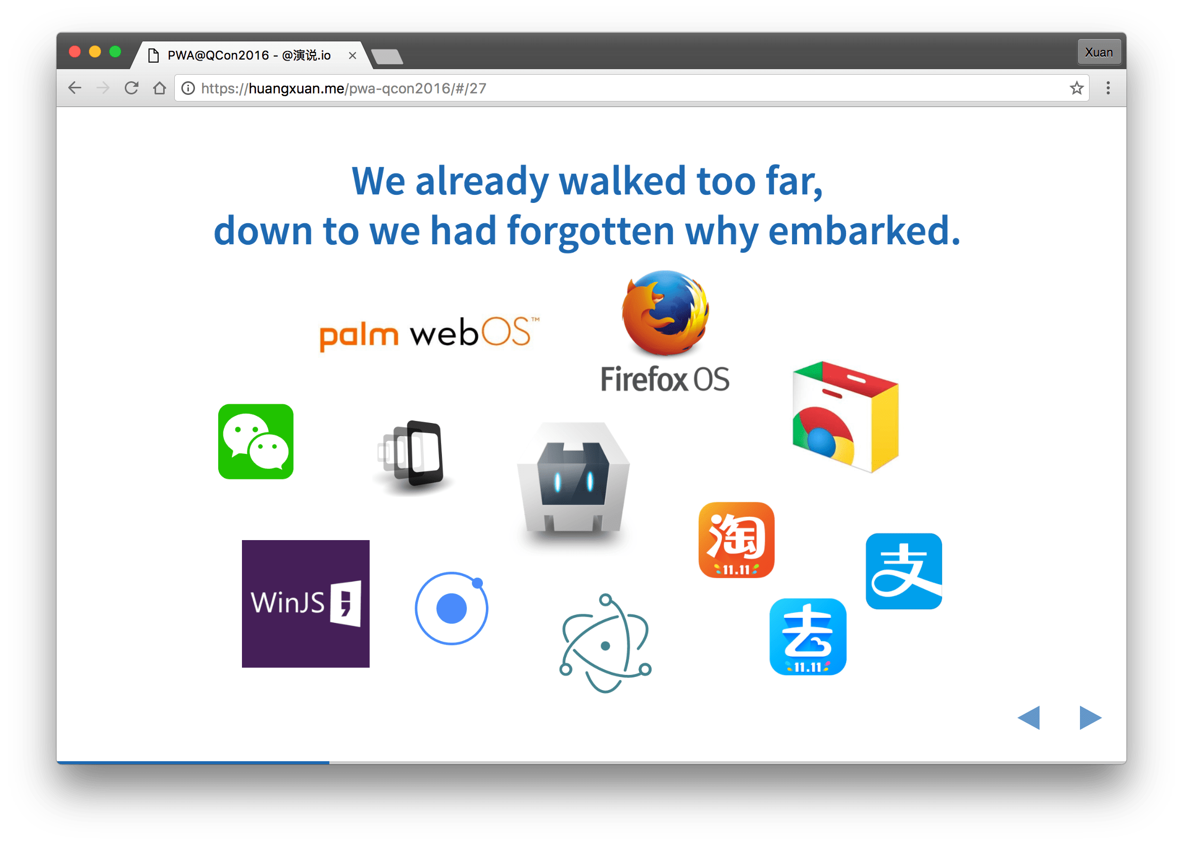 在不丢失 web 的开放灵魂,在不需要依靠 Hybrid 把应用放在 App Store 的前提下,让 web 应用能够渐进式地跳脱出浏览器的标签,变成用户眼中的 App。这是 Alex Russell 在 2015 年提出 PWA 概念的原委。