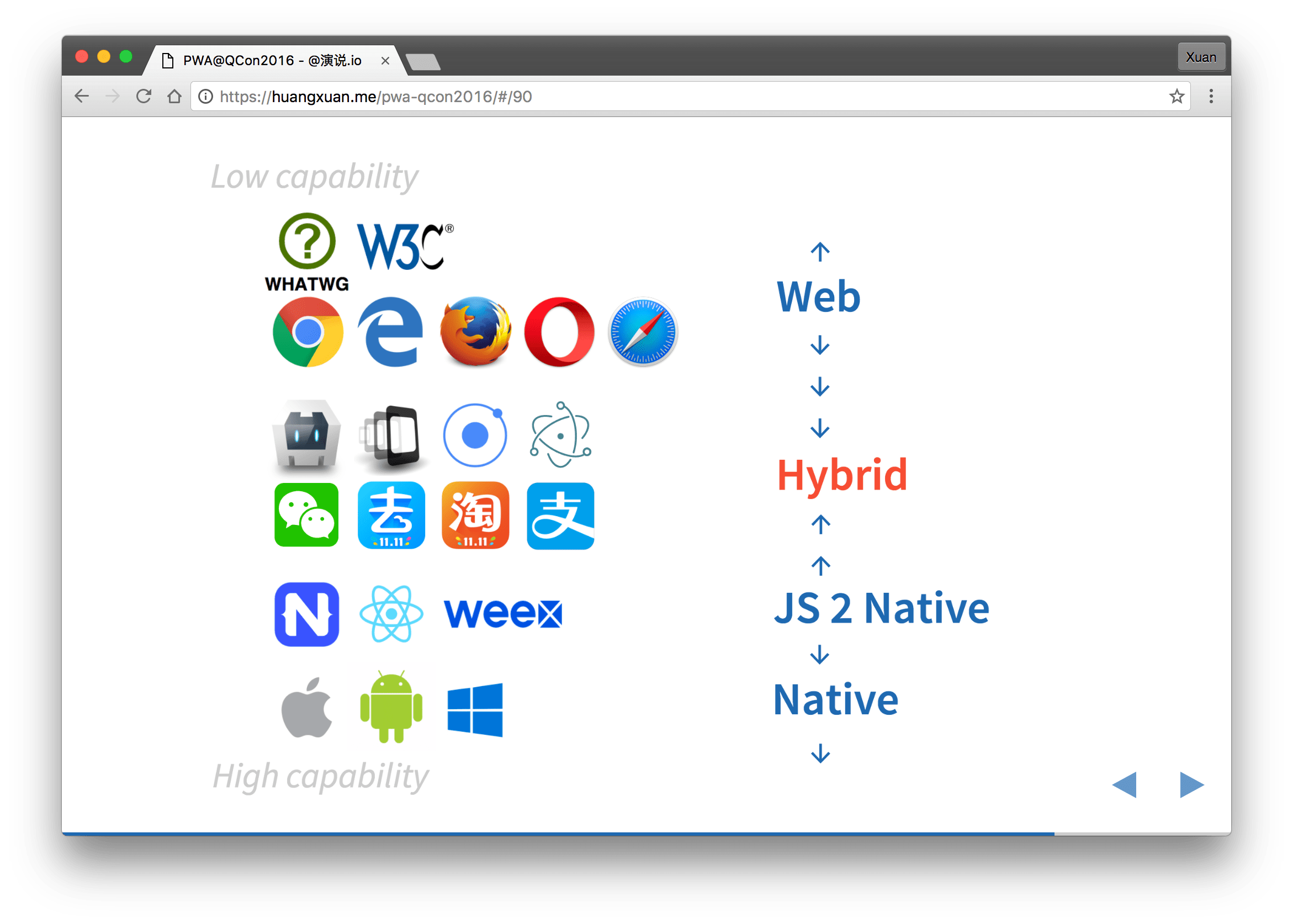 贺老(贺师俊)曾说过:「从纯 Web 到纯 Native,之间有许多可能的点」。当考虑移动应用的技术选型时,除了 Web 与原生应用,我们还有各种不同程度的 Hybrid,还有今年爆发的诸多 JS-to-Native 方案。